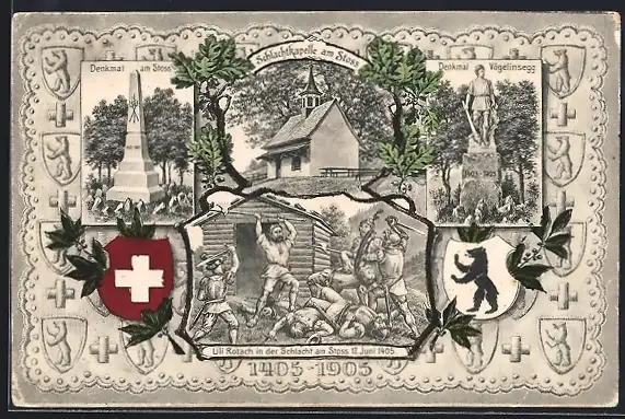 AK Stoss, Schachtkapelle, Denkmal Vögelinsegg, Uli Rotach in der Schlacht 1405