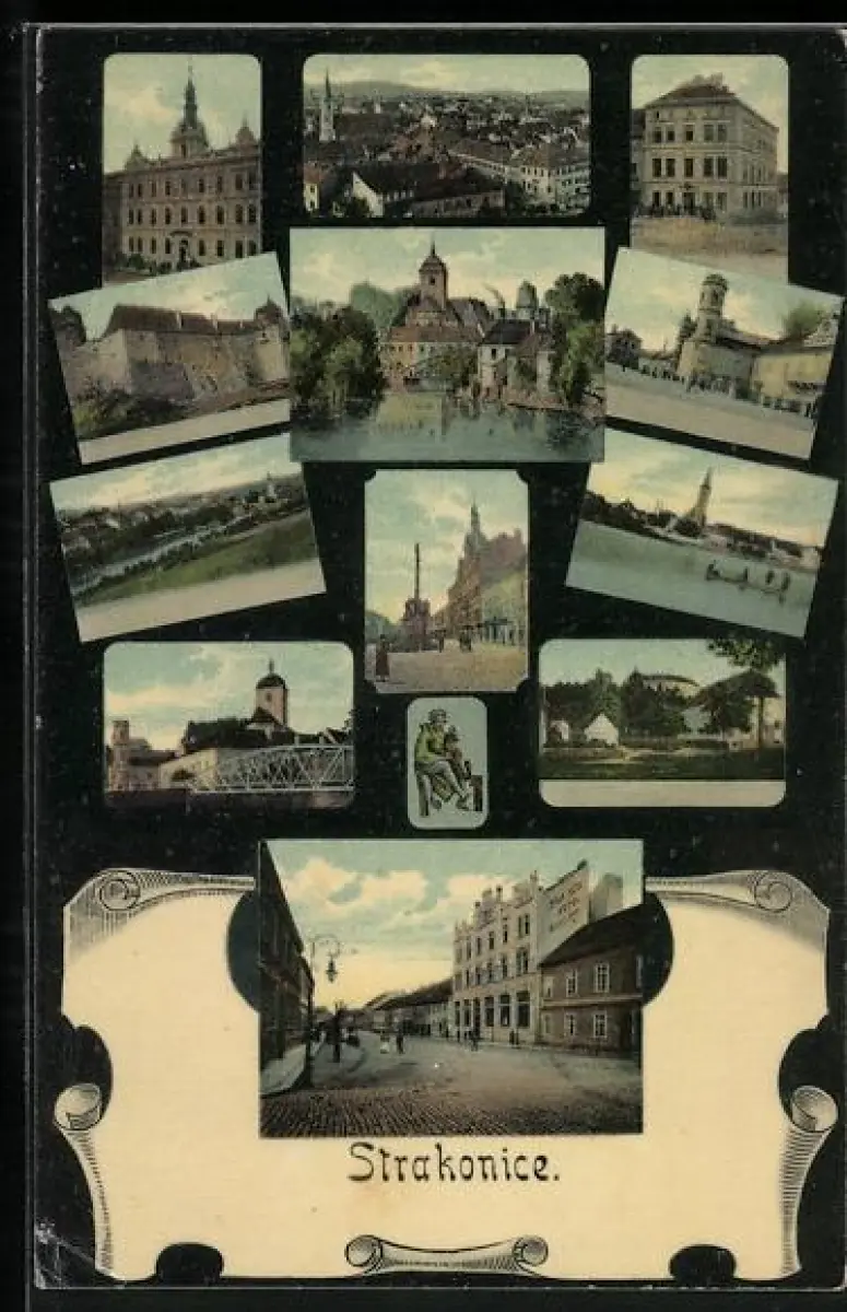AK Strakonice, Kirche, Strassenansicht und Brücke