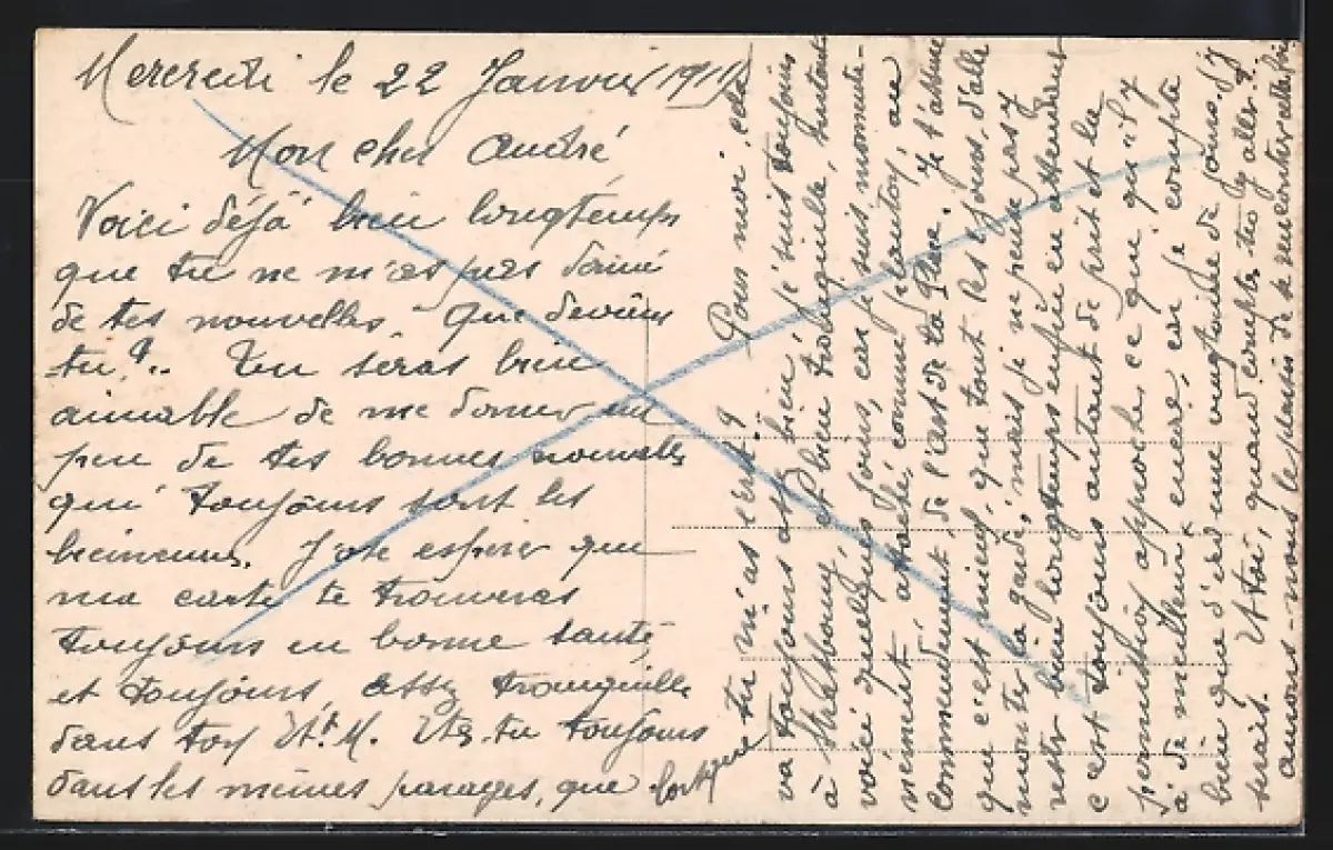 Personenbezogene Daten auf der Rückseite der Karte wurden durch blauen Textmarker unkenntlich gemacht. Die blauen Stellen sind auf die Vorderseite durchgeweicht und wirken sich negativ auf das Postkartenfoto aus