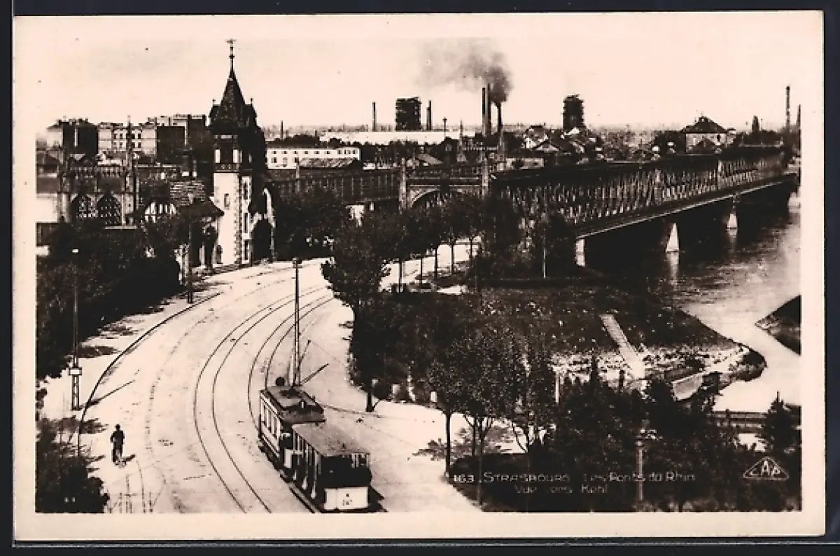 AK Strasbourg, Vue sur le pont du Rhin avec tramway et cheminées industrielles en arrière-plan