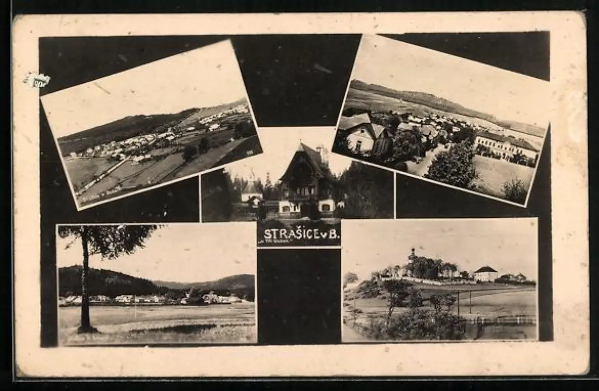 AK Strasice v. B., Gasthaus, Feldpartie mit Blick zur Kirche, Teilansicht vom Ort
