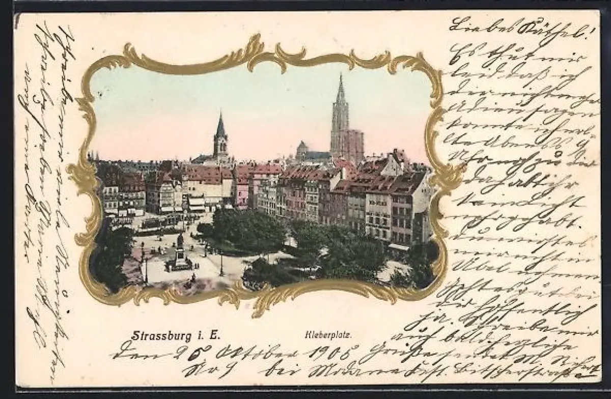 AK Strassburg, Kleberplatz mit Denkmal, Strassenbahnen und Stadtpanorama aus der Vogelschau, im Goldrahmen
