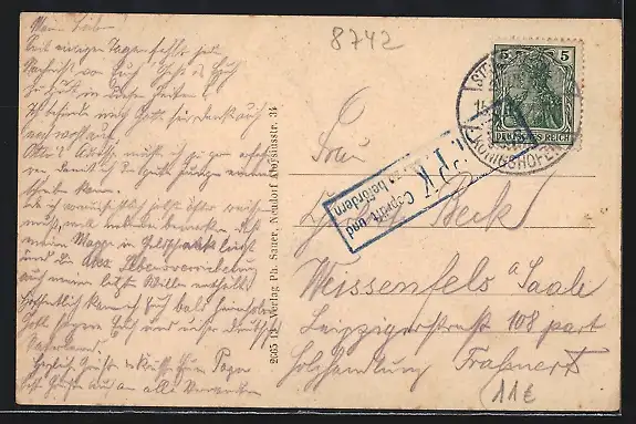 Personenbezogene Daten auf der Rückseite der Karte wurden durch blauen Textmarker unkenntlich gemacht. Die blauen Stellen sind auf die Vorderseite durchgeweicht und wirken sich negativ auf das Postkartenfoto aus