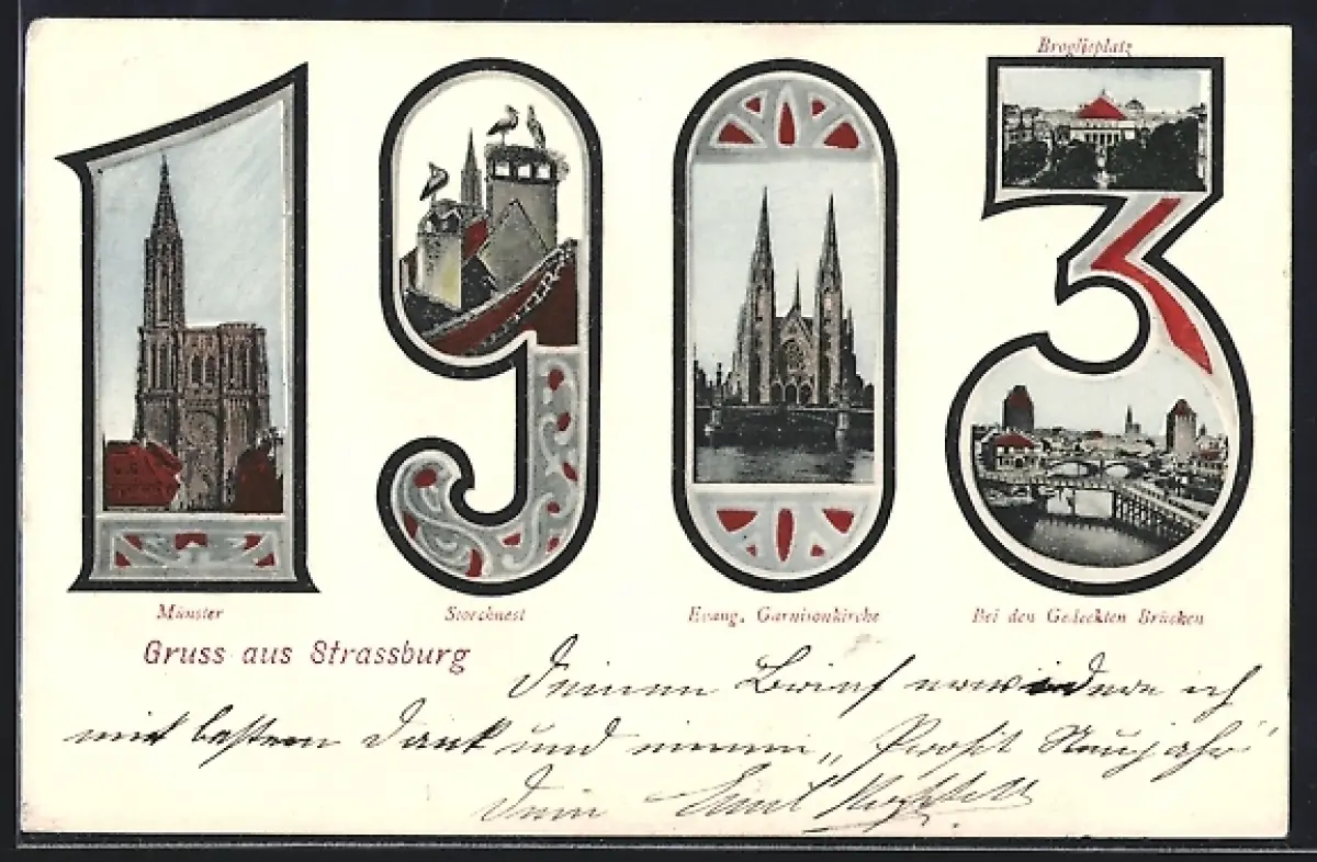 AK Strassburg, Münster, Evangelische Garnisonkirche und Storchnest in Jahreszahl 1903, Passepartout