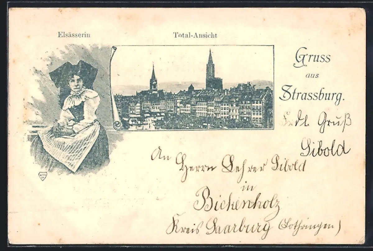 AK Strassburg, Ortsansicht und Elsässerin in Tracht