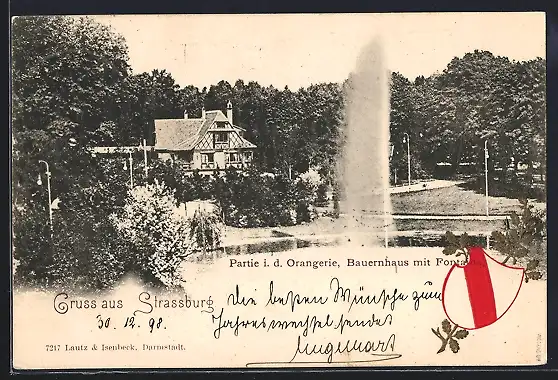 AK Strassburg, Partie i. d. Orangerie, Bauernhaus mit Fontaine