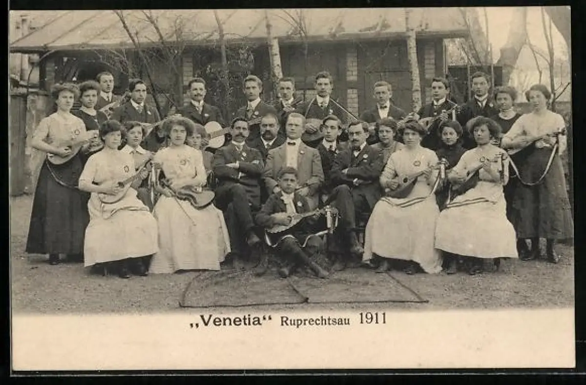 AK Strassburg, Venetia Ruprechtsau 1911, Gruppenbild Männer und Frauen mit ihren Instrumenten