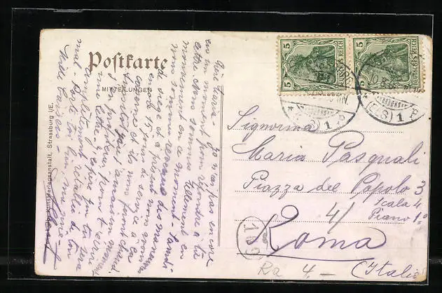 Personenbezogene Daten auf der Rückseite der Karte wurden durch blauen Textmarker unkenntlich gemacht. Die blauen Stellen sind auf die Vorderseite durchgeweicht und wirken sich negativ auf das Postkartenfoto aus