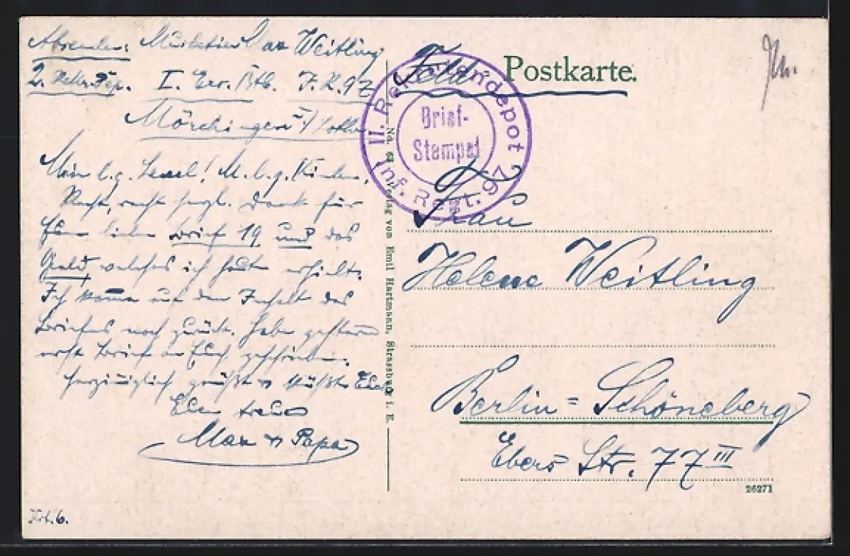 Personenbezogene Daten auf der Rückseite der Karte wurden durch blauen Textmarker unkenntlich gemacht. Die blauen Stellen sind auf die Vorderseite durchgeweicht und wirken sich negativ auf das Postkartenfoto aus
