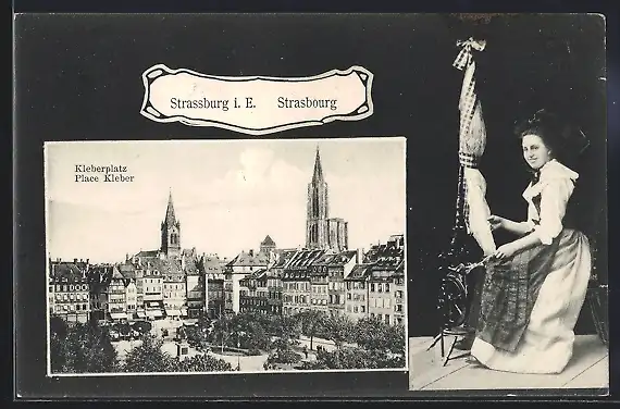 AK Strassburg i.E., Blick über den Kleberplatz, Frau in Tracht am Spinnrad