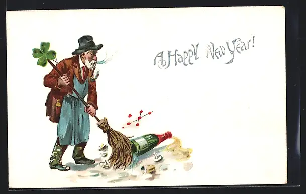 AK Strassenkehrer fegt eine Sektflasche weg, Neujahrsgruss