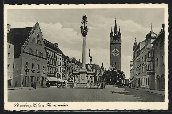 AK Straubing, Unterer Theresienplatz mit Brunnen und Geschäften