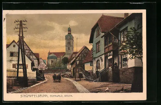 AK Strümpfelbrunn /Odenw., Strassenpartie mit Strommast und Kirche