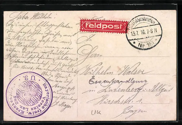 gelaufen 1916 als Feldpost, Eckknick unten re., guter Zustand