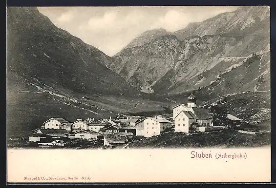 AK Stuben, Ortsansicht mit Arlbergbahn