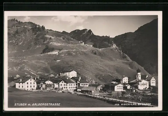 AK Stuben, Teilansicht mit Kirche und Arlbergstrasse