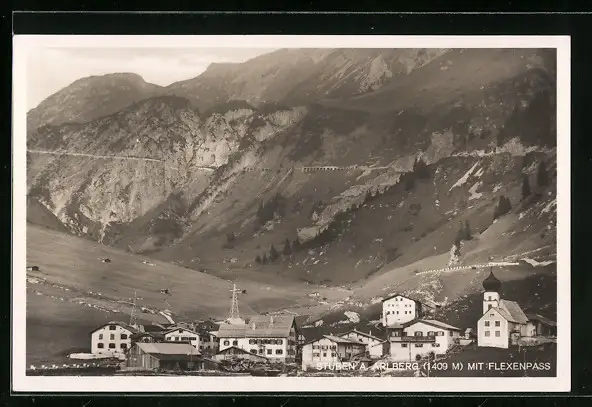 AK Stuben a. Arlberg, Teilansicht mit Bergen und Flexenpass