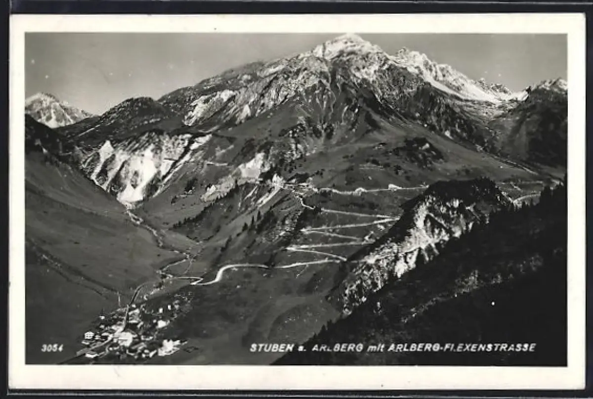 AK Stuben am Arlberg, Panorama mit Arlberg-Flexenstrasse
