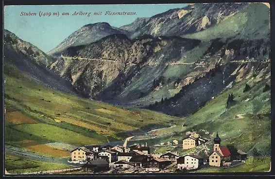 AK Stuben am Arlberg, Totalansicht mit Flexenstrasse