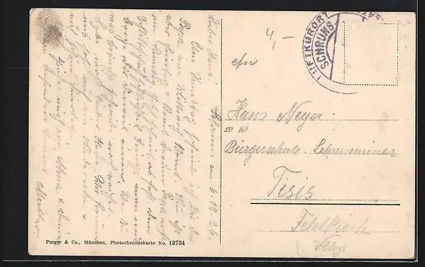 alte Ansichtskarte, gelaufen, Briefmarke entfernt, rückseitig Oberflächenschaden, guter Zustand