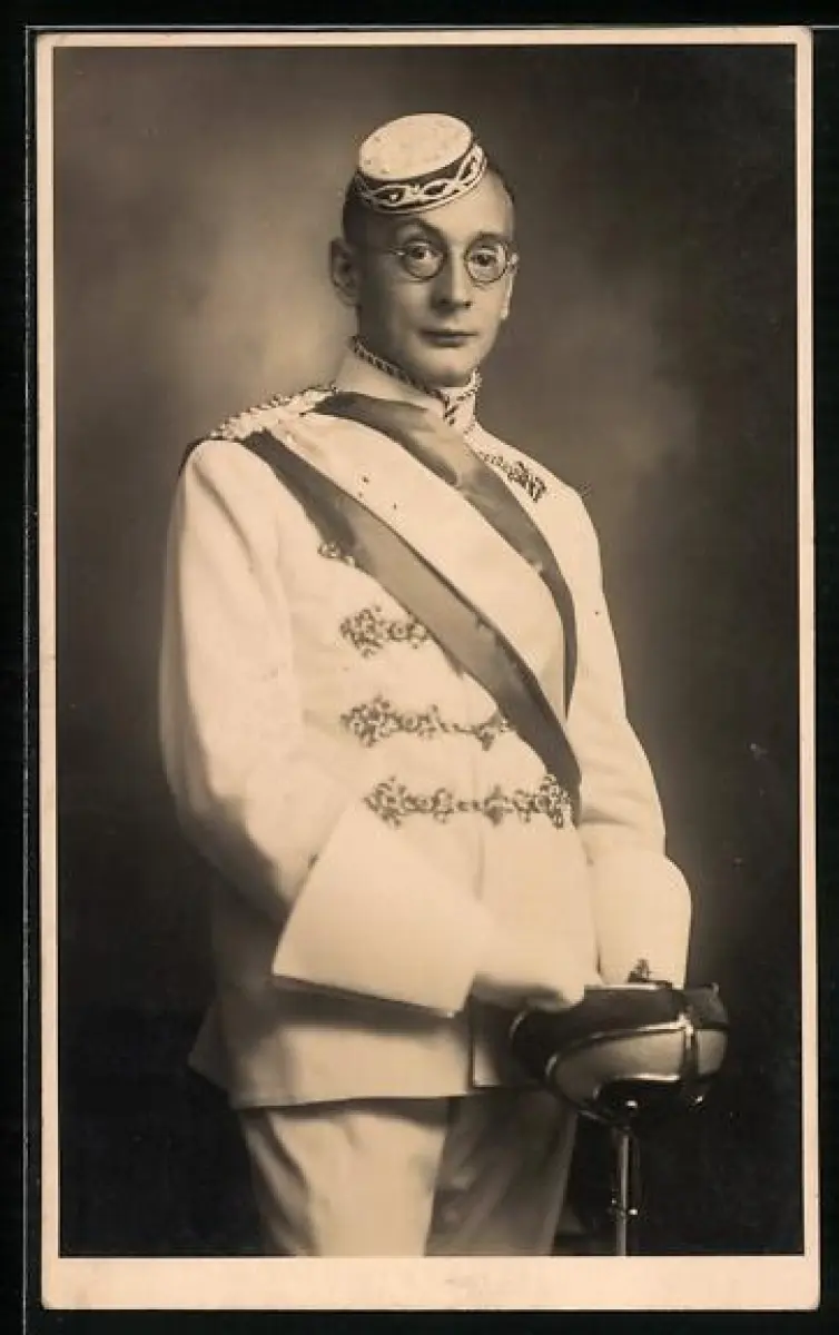 AK Student mit Schärpe, Tönnchen und Schläger, studentische Szene