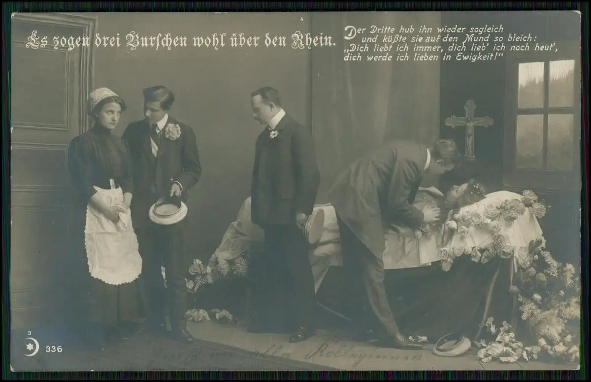 AK Studentika Gedicht Burschen wohl über den Rhein Frau auf Totenbett 1910 gel.