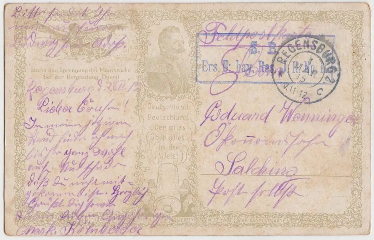 Bemerkungen: Beschriebene Postkarte mit Gebrauchsspuren. Postkarte ohne Briefmarke und mit Poststempel (gelaufen). Bitte beachten Sie auch unsere Abbildungen. Feldpostkarte.