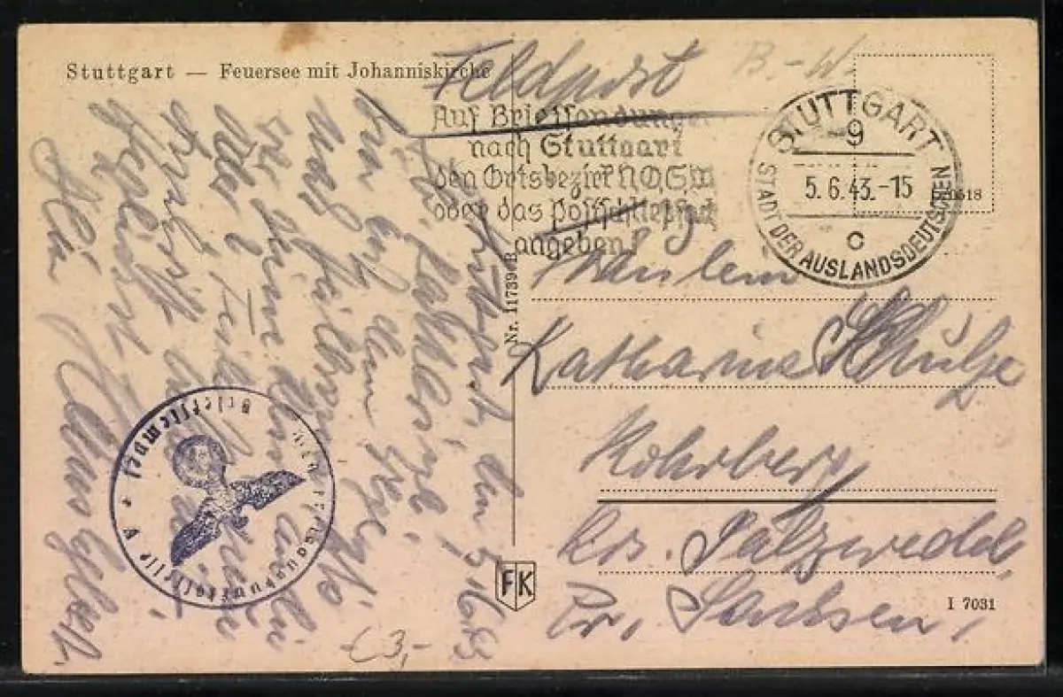 Personenbezogene Daten auf der Rückseite der Karte wurden durch blauen Textmarker unkenntlich gemacht. Die blauen Stellen sind auf die Vorderseite durchgeweicht und wirken sich negativ auf das Postkartenfoto aus