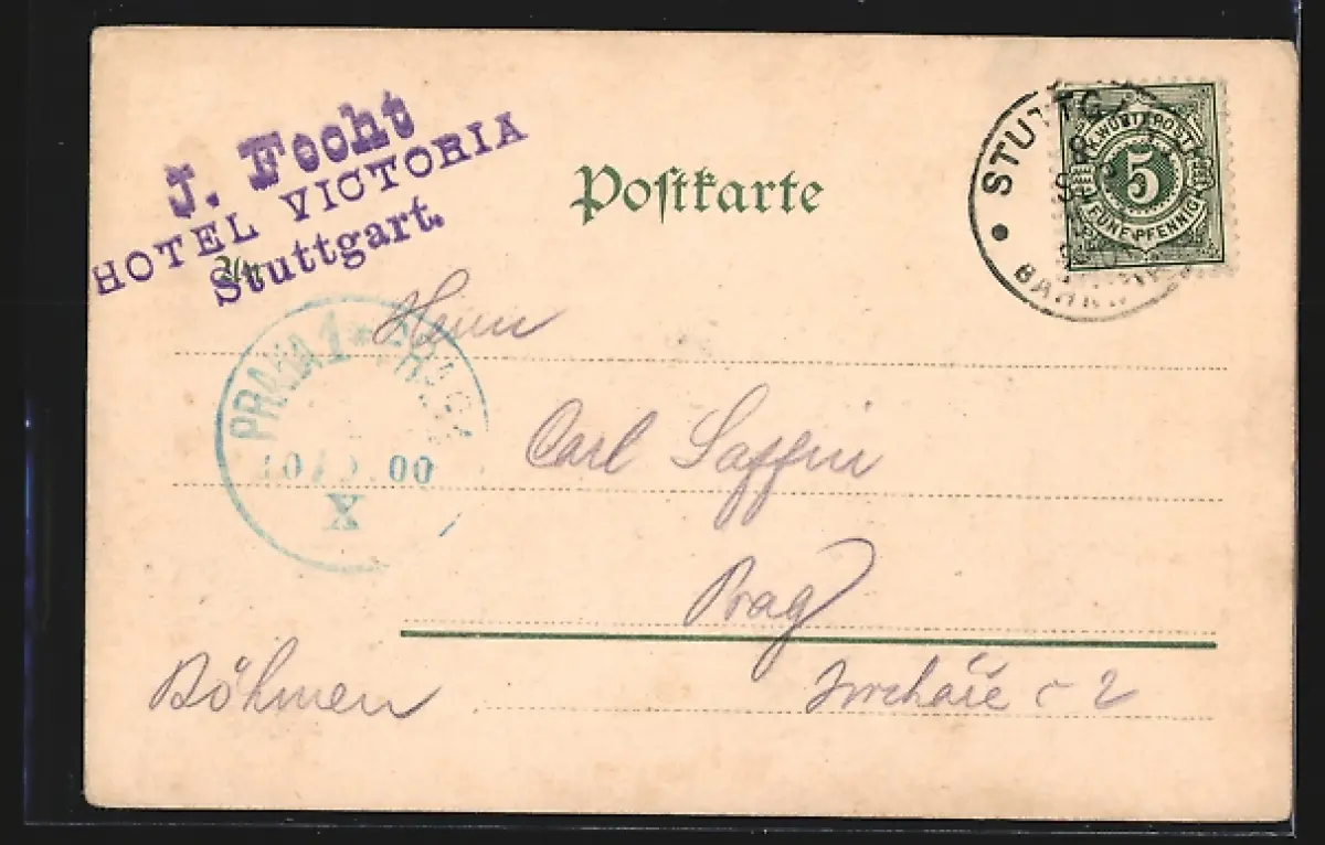 Personenbezogene Daten auf der Rückseite der Karte wurden durch blauen Textmarker unkenntlich gemacht. Die blauen Stellen sind auf die Vorderseite durchgeweicht und wirken sich negativ auf das Postkartenfoto aus