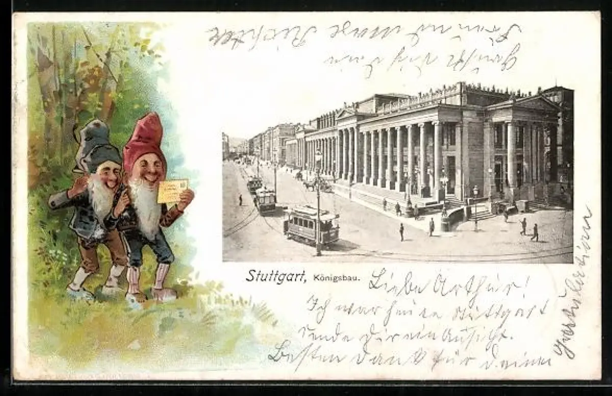 AK Stuttgart, Königsbau mit Strassenbahn, Passepartout mit Zwergen
