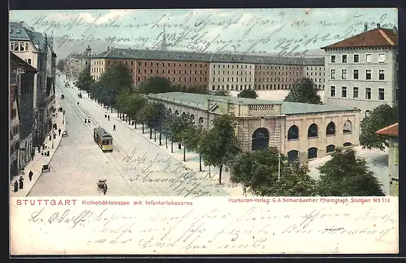 AK Stuttgart, Rothebühlstrasse mit Infanteriekaserne, Strassenbahn