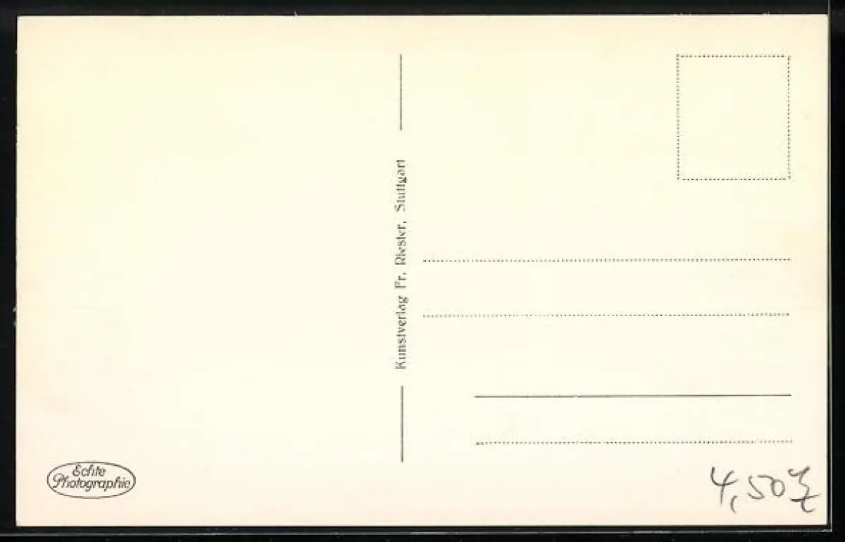 Personenbezogene Daten auf der Rückseite der Karte wurden durch blauen Textmarker unkenntlich gemacht. Die blauen Stellen sind auf die Vorderseite durchgeweicht und wirken sich negativ auf das Postkartenfoto aus
