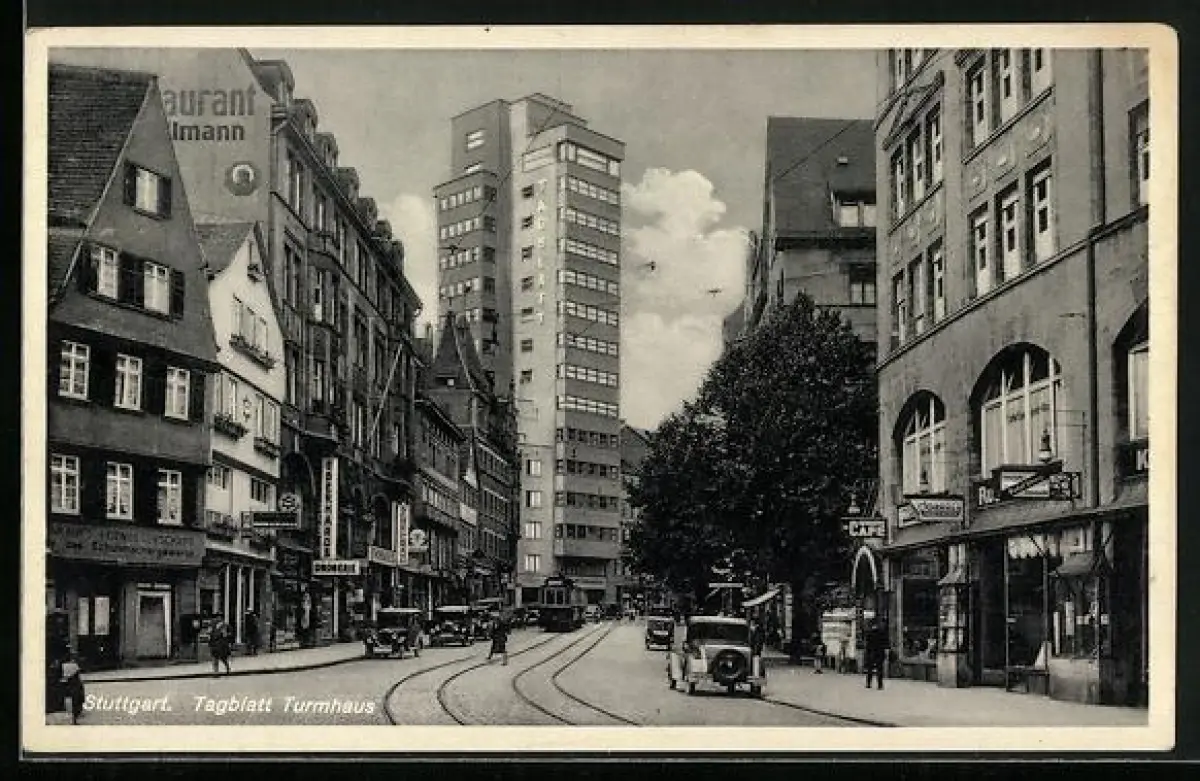 AK Stuttgart, Strassenpartie mit Tagblatt-Turmhaus, Strassenbahn