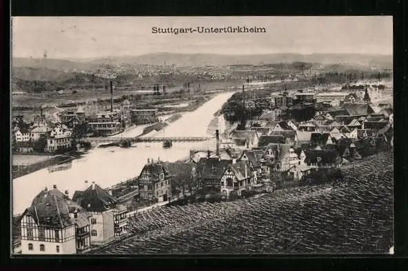 AK Stuttgart-Untertürkheim, Ortsansicht und Flusspartie aus der Vogelschau