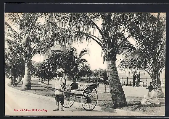 AK Südafrikaner wartet mit seiner Rikscha, Europäerin liest im Schatten einer Palme