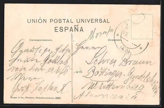 Personenbezogene Daten auf der Rückseite der Karte wurden durch blauen Textmarker unkenntlich gemacht. Die blauen Stellen sind auf die Vorderseite durchgeweicht und wirken sich negativ auf das Postkartenfoto aus