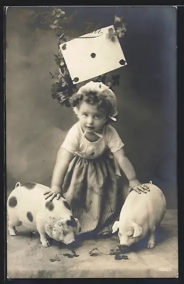 AK Süsses Mädchen streichelt die Glücksschweinchen, Neujahrsgruss