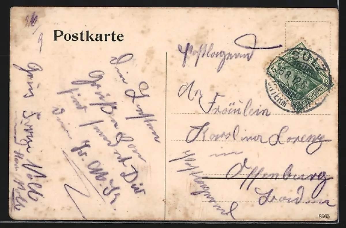 Personenbezogene Daten auf der Rückseite der Karte wurden durch blauen Textmarker unkenntlich gemacht. Die blauen Stellen sind auf die Vorderseite durchgeweicht und wirken sich negativ auf das Postkartenfoto aus