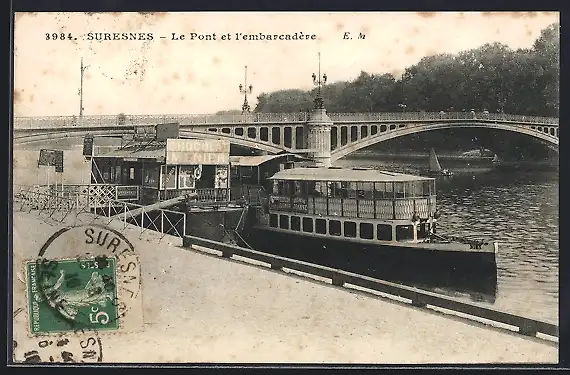 AK Suresnes, Le Pont et l`embarcadère avec un bateau amarré sur la Seine