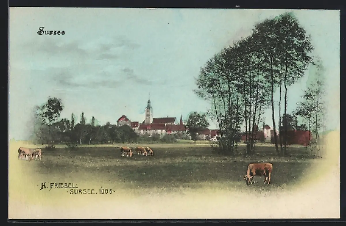 AK Sursee, Blick zur Kirche, Kühe auf der Weide