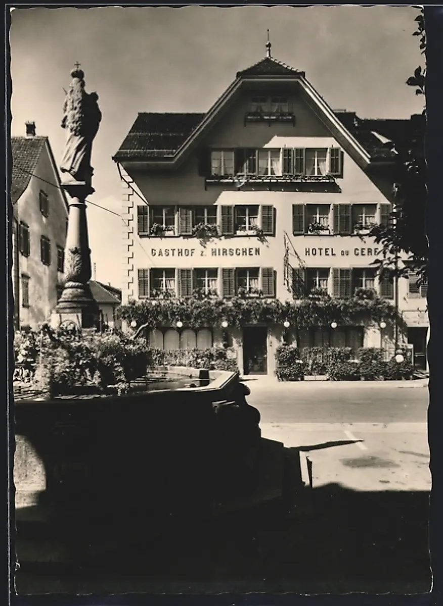 AK Sursee, Hotel Hirschen mit Brunnen und Säulendenkmal