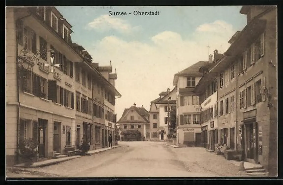 AK Sursee, Oberstadt, Strassenpartie mit Gasthof zum Kreuz