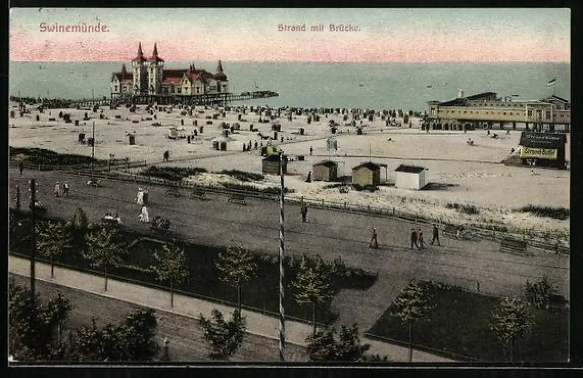 AK Swinemünde, Blick auf den Strand mit Brücke