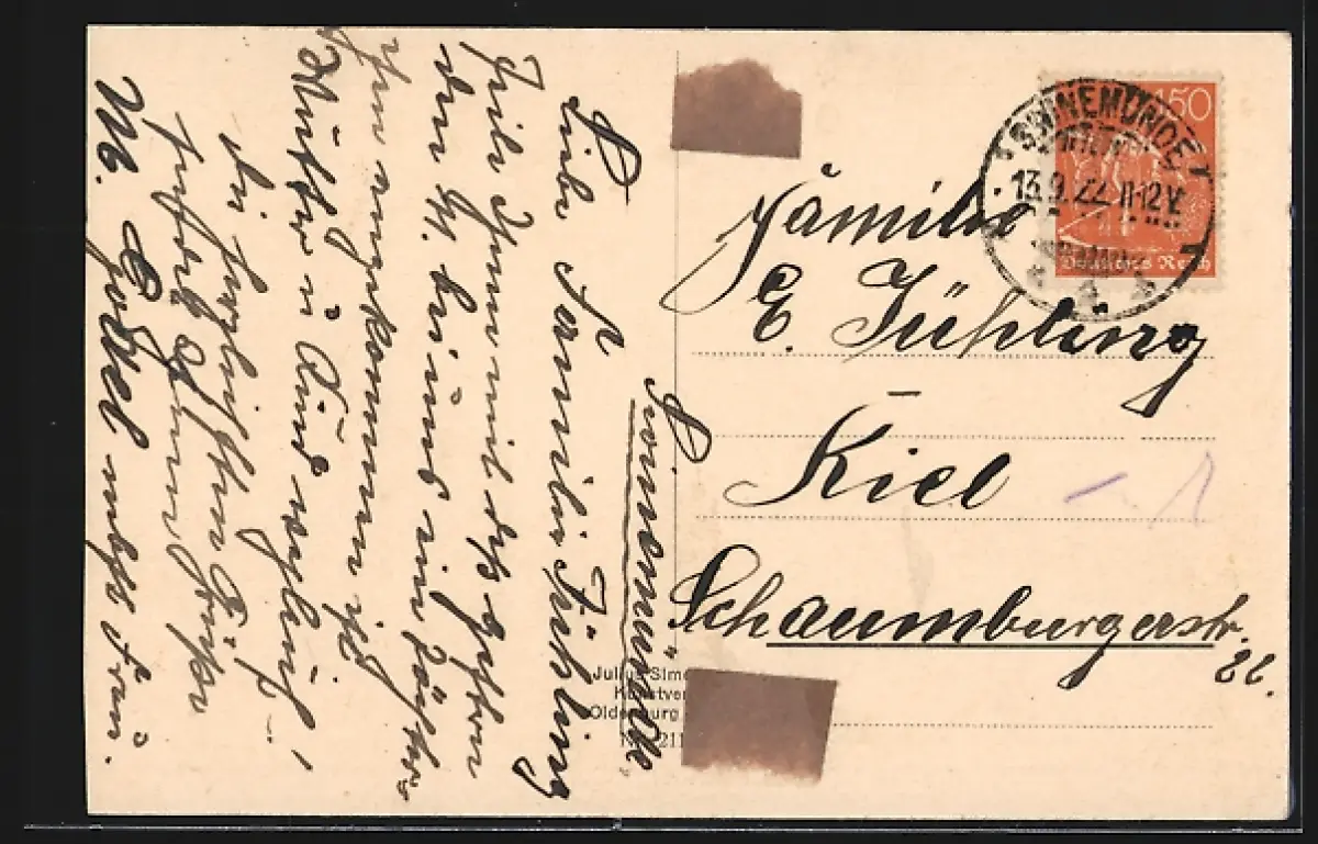 gelaufen 1922, rückseitig Klebe- und Papierreste, geringer Oberflächenschaden, sonst guter Zustand