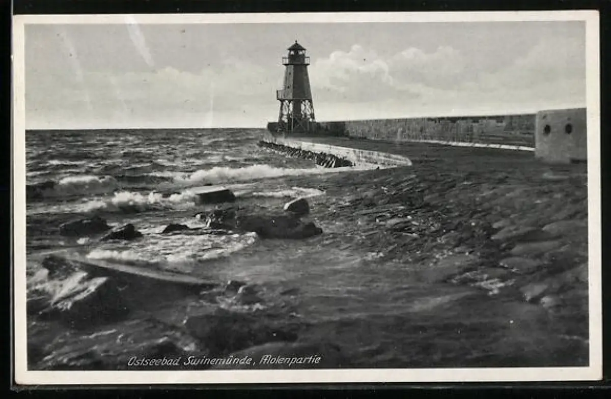 AK Swinemünde, Molenpartie mit Leuchtturm