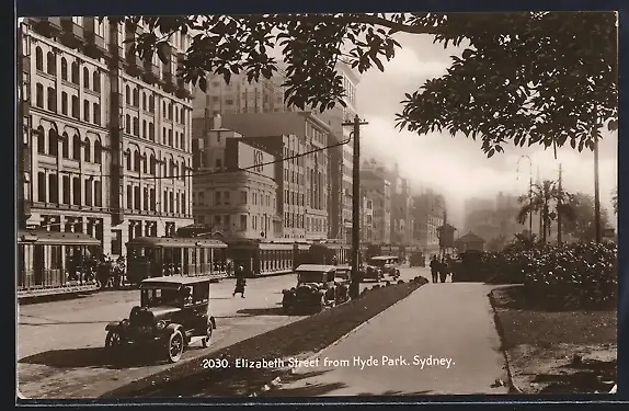 AK Sydney, Elizabeth Street from Hyde Park, Strassenbahn