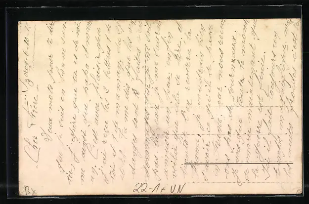 Personenbezogene Daten auf der Rückseite der Karte wurden durch blauen Textmarker unkenntlich gemacht. Die blauen Stellen sind auf die Vorderseite durchgeweicht und wirken sich negativ auf das Postkartenfoto aus