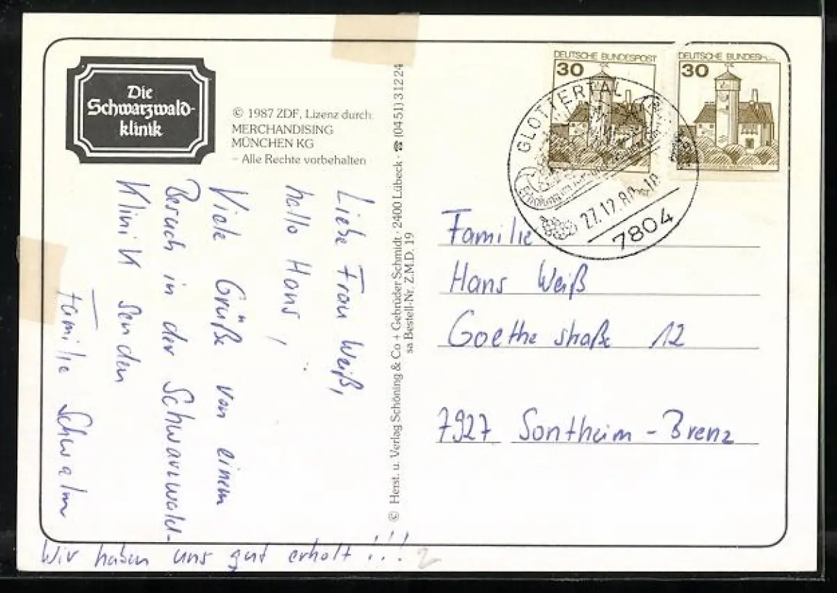 alte Ansichtskarte, gelaufen 1988, rückseitig Klebe- und Papierreste, guter Zustand