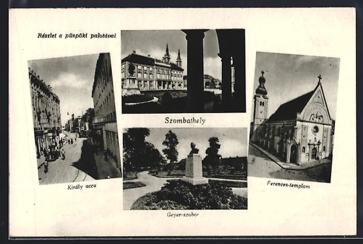 AK Szombathely, Kiraly ucca, Ferences-templom, Geyer-szobar