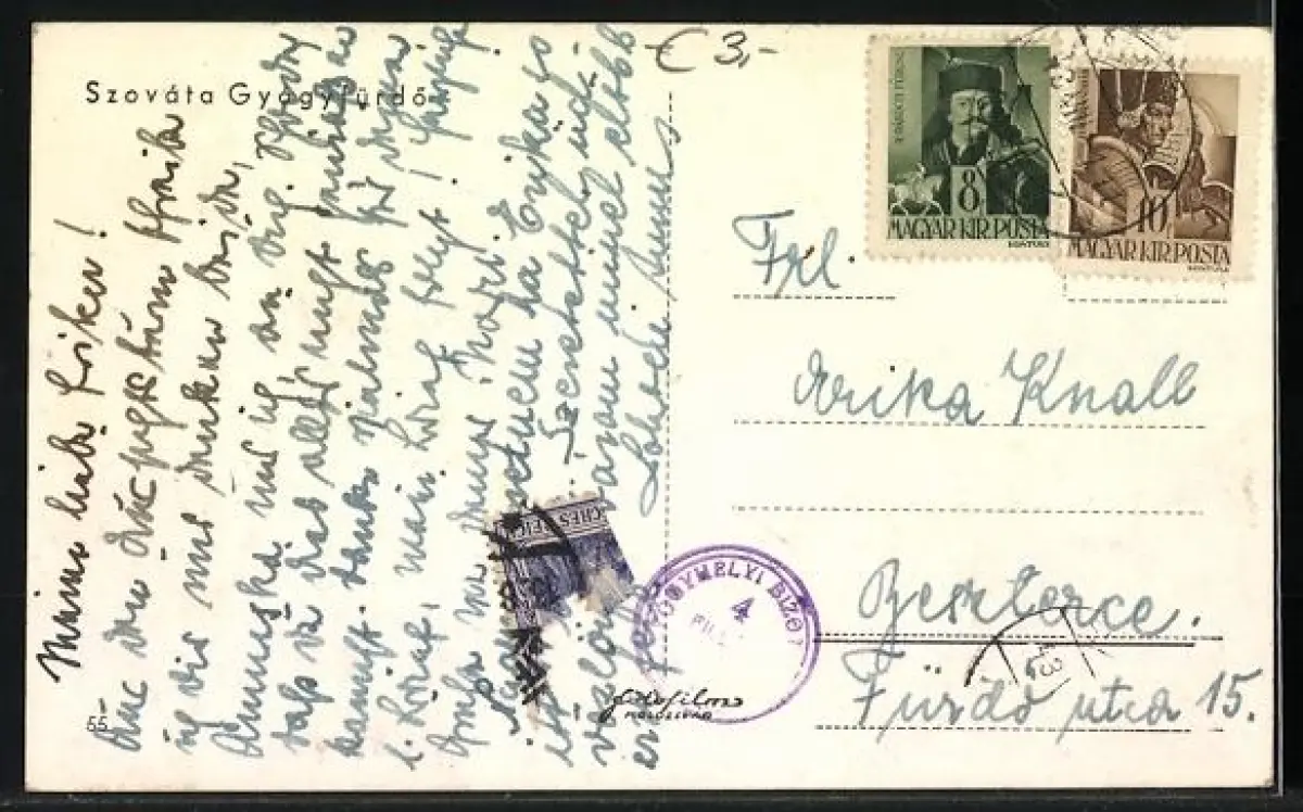 Personenbezogene Daten auf der Rückseite der Karte wurden durch blauen Textmarker unkenntlich gemacht. Die blauen Stellen sind auf die Vorderseite durchgeweicht und wirken sich negativ auf das Postkartenfoto aus